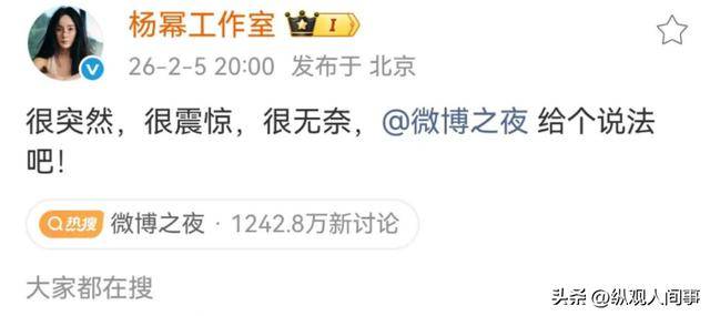 面对愈演愈烈的争议,杨幂工作室率先发声,晚上 8 点在微博发了句 "很突然,很震惊,很无奈,@微博之夜 给个说法吧!"。