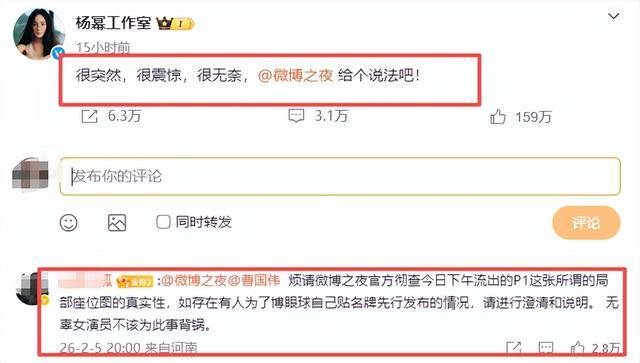 眼看着座位安排乱成一团,还被各种不实言论缠上,杨幂工作室直接在晚上8点整发文:“很突然,很震惊,很无奈,@微博之夜 给个说法吧!”