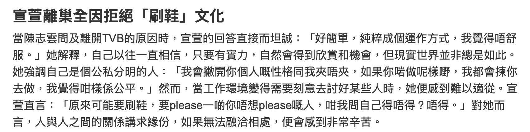 宣萱受邀做客深夜访谈节目《又系时候同一天讲再见》,在节目中她就罕见揭露当年离巢TVB的原因。宣萱称当时离开是因为已经无法习惯TVB的运作方式,那样的运作方式让她觉得不舒服。她称自己一直都很相信只要有实力就会得到欣赏与机会,然而现实世界并非如此。她直言当时TVB的工作环境已经变得要去刻意讨好某些人,才会获得机会,这样的方式让她觉得不舒服。换言之如果想要获得更好的机会,需要去取悦一些自己根本就不想取悦的人。她自认做不到,也很难融入其中,所以决定要离巢。