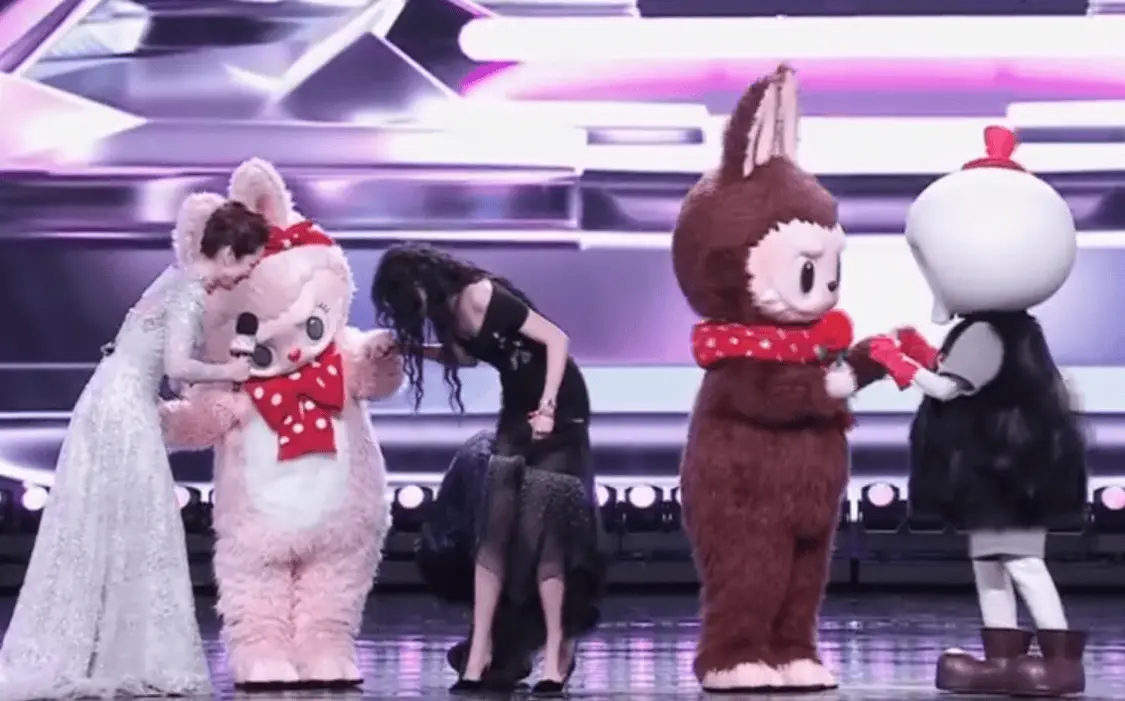 2月5日,关晓彤身穿细高跟鞋登台颁奖,将两只鞋跟卡入缝隙。同台主持人尼格买提紧急救场,蹲下身将鞋跟拔出。
