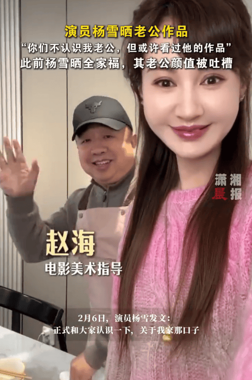 2月6日,演员杨雪晒出老公赵海的作品,并发文称:“正式和大家认识一下,关于我家那口子。”她在视频中表示:“你们不认识我老公,但或许看过他的作品。”此前杨雪晒全家福,其老公颜值被吐槽。