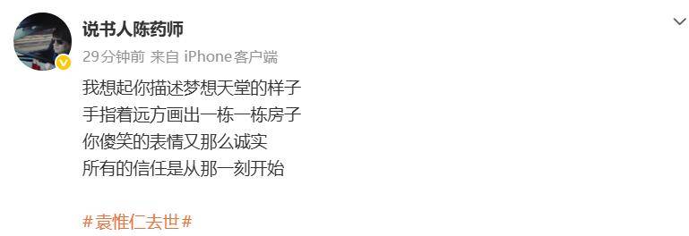 财经作家陈伟分享了《梦醒了》作词中最精华的一部分,悼念他,以他的年纪,也算是正好经历过袁惟仁的全盛时代了。