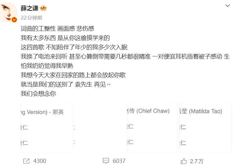 薛之谦还写了一篇文章悼念他,整篇文章都充满了真情,还截图出自己最喜欢他的四首歌,能感觉到,他对袁惟仁是粉丝对偶像的喜欢。