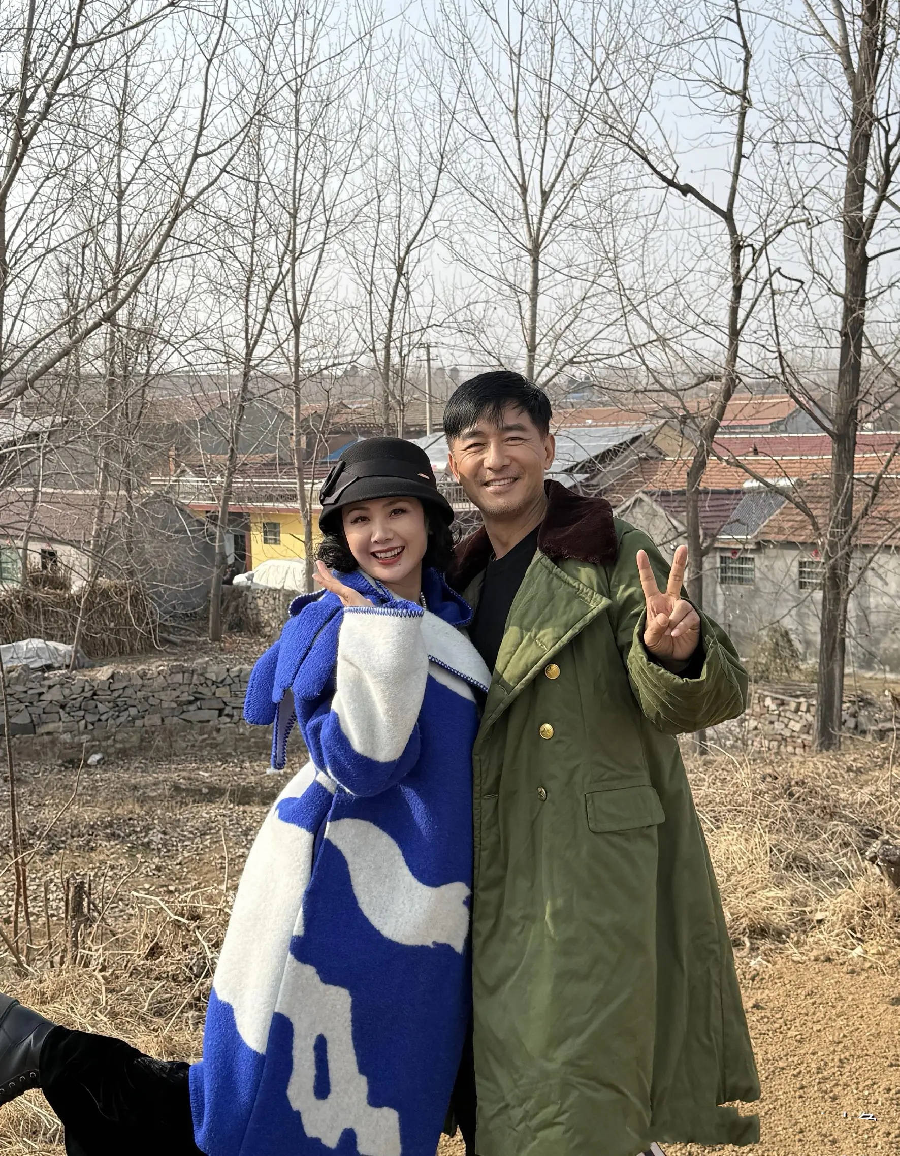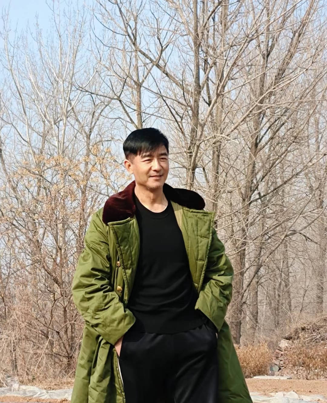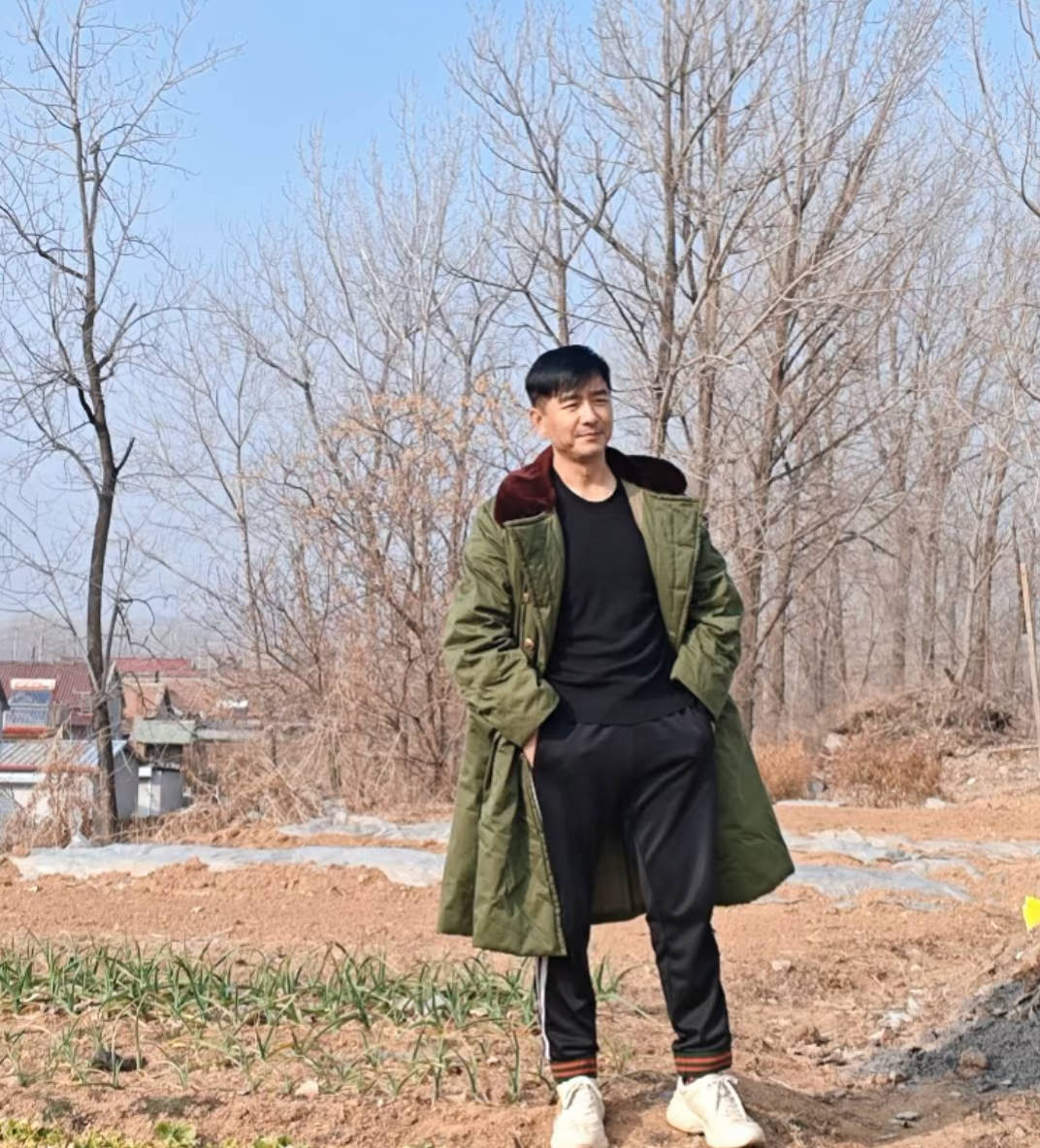 虽然是大明星,但是回到老家就非常接地气。郭晓东穿了一件军大衣站在村头拍照,他皮肤黝黑、身材挺拔。