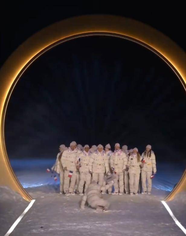 要说最出其不意的,就是法国队登场的时候。他们穿着白色的羽绒外套,版型鼓鼓囊囊的,远远看去就像一群宇航员,特别显眼。