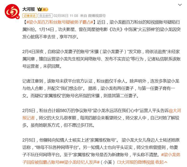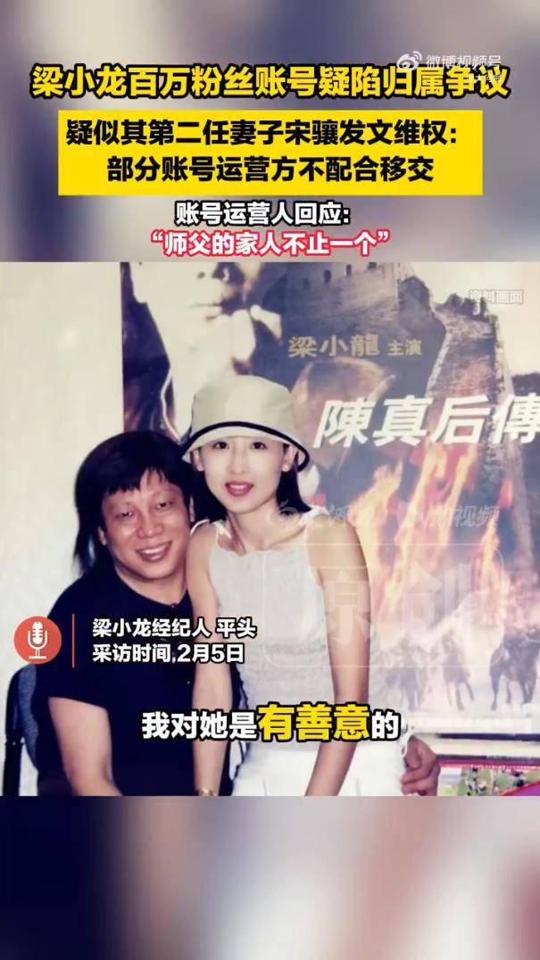 2月4日深夜,一个名为“宋骧(梁小龙妻子)”的账号突然发文,剑指有人“未经家属同意,擅自运营梁小龙先生相关网络账号、发布不实言论”,并表示将依法追责。记者调查发现,该账号粉丝仅千余人,且未获平台官方认证,除声明外只发了几条配文“我们想念你”的合影。记者尝试联系,未获回复。