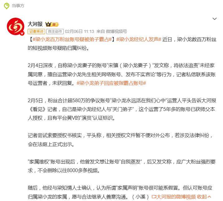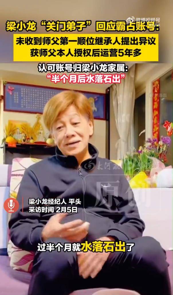这把“火”直接烧向了坐拥超580万粉丝的账号“梁小龙永远活在我们心中”。2月5日,该账号运营者平头通过媒体紧急回应。他亮明身份:既是梁小龙的经纪人,也是其“关门弟子”。他声称,这个运营了5年多的账号早已获得师父本人授权,并拥有平台加V的“演员”认证标识,可谓“师出有名”。