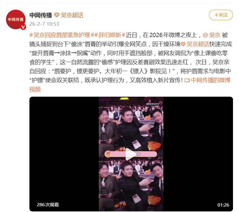 谁能想到,一贯以“战狼”硬汉形象示人的吴京,竟因为一支小小的唇膏,在2026年微博之夜抢尽了风头。一段他被镜头捕捉到“偷涂唇膏”的现场视频引爆全网,其本人一句“唇要护,镖更要护”的幽默回应,更是将这场意外插曲变成了教科书级别的“反差萌”营销。