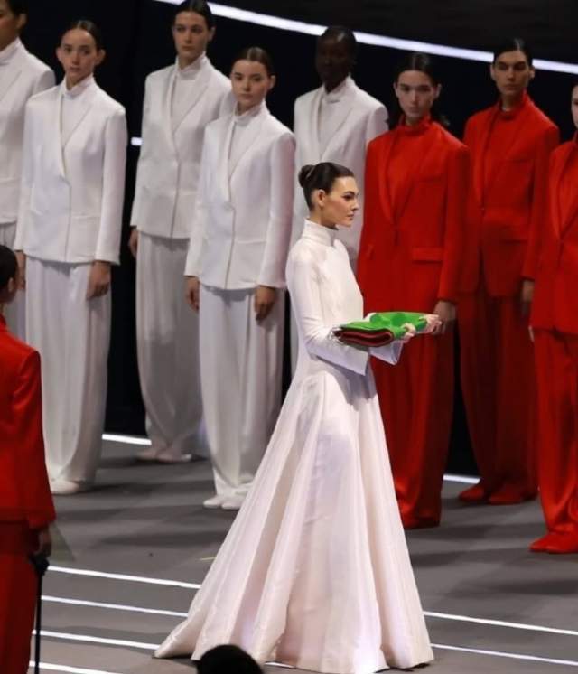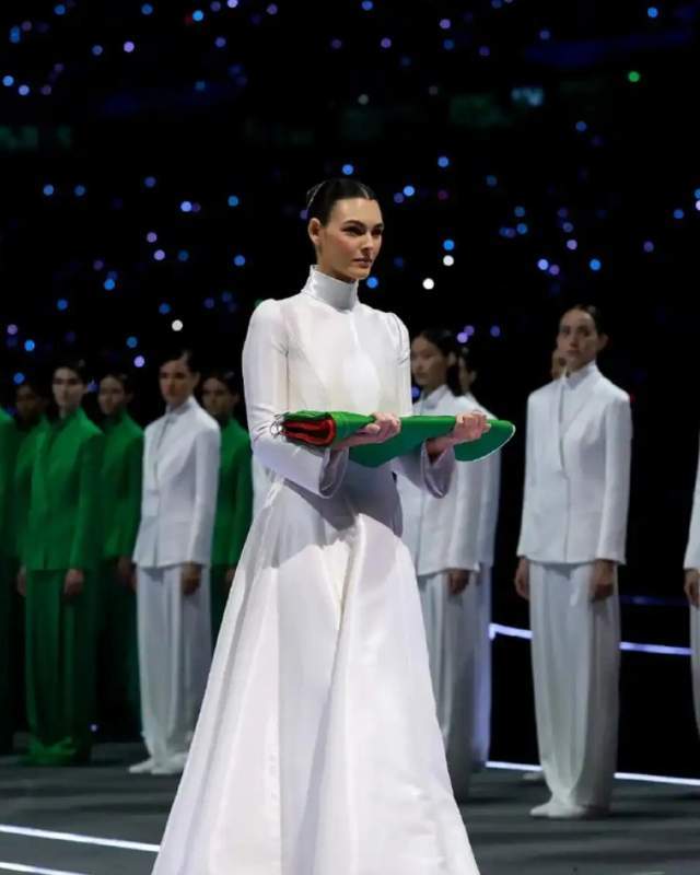 她穿着阿玛尼定制的白色礼服,步伐稳得像走T台,表情庄重得像在参加国葬。没有多余动作,没有刻意微笑,就是把国旗从A点递到B点。简单吗?简单。容易吗?看看隔壁那些用力过猛的时尚灾难现场就知道了。