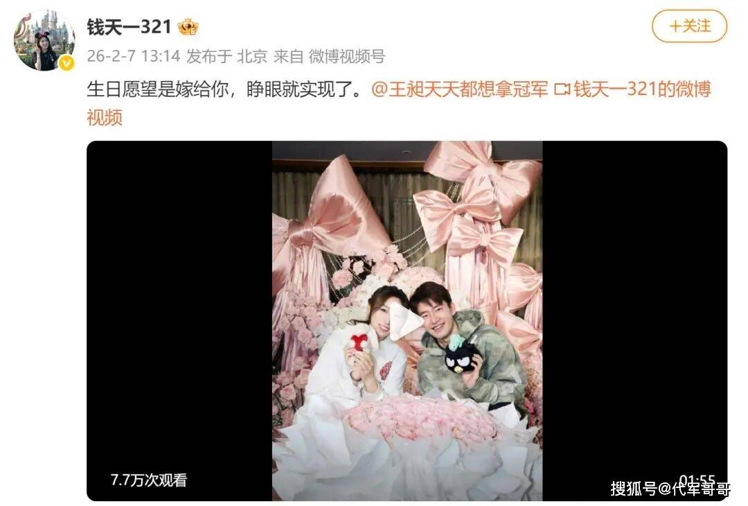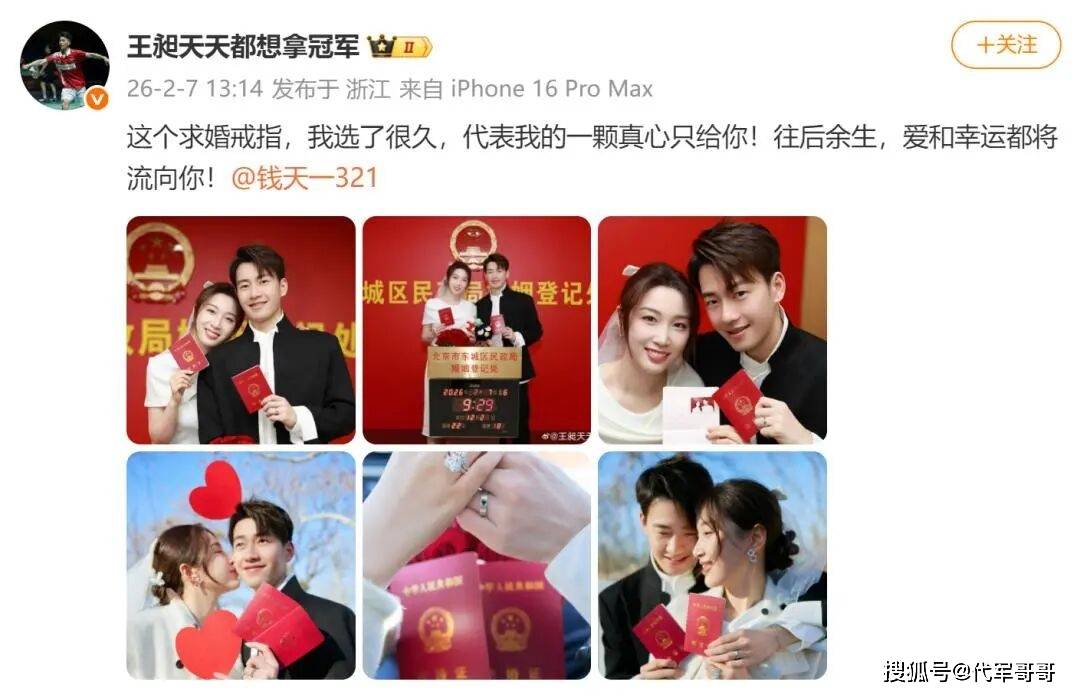 钱天一则同步发布了求婚现场视频,配文“生日愿望是嫁给你,睁眼就实现了”,用镜头记录下属于两人的浪漫瞬间。照片中,两人身着简约白上衣,并肩微笑,无名指上的钻戒醒目亮眼,官宣仅10分钟点赞便突破百万,相关话题迅速登顶热搜,热度持续攀升。值得一提的是,王昶的社交平台关注列表仅有钱天一与羽毛球相关账号,被网友赞为“顶级专一”。