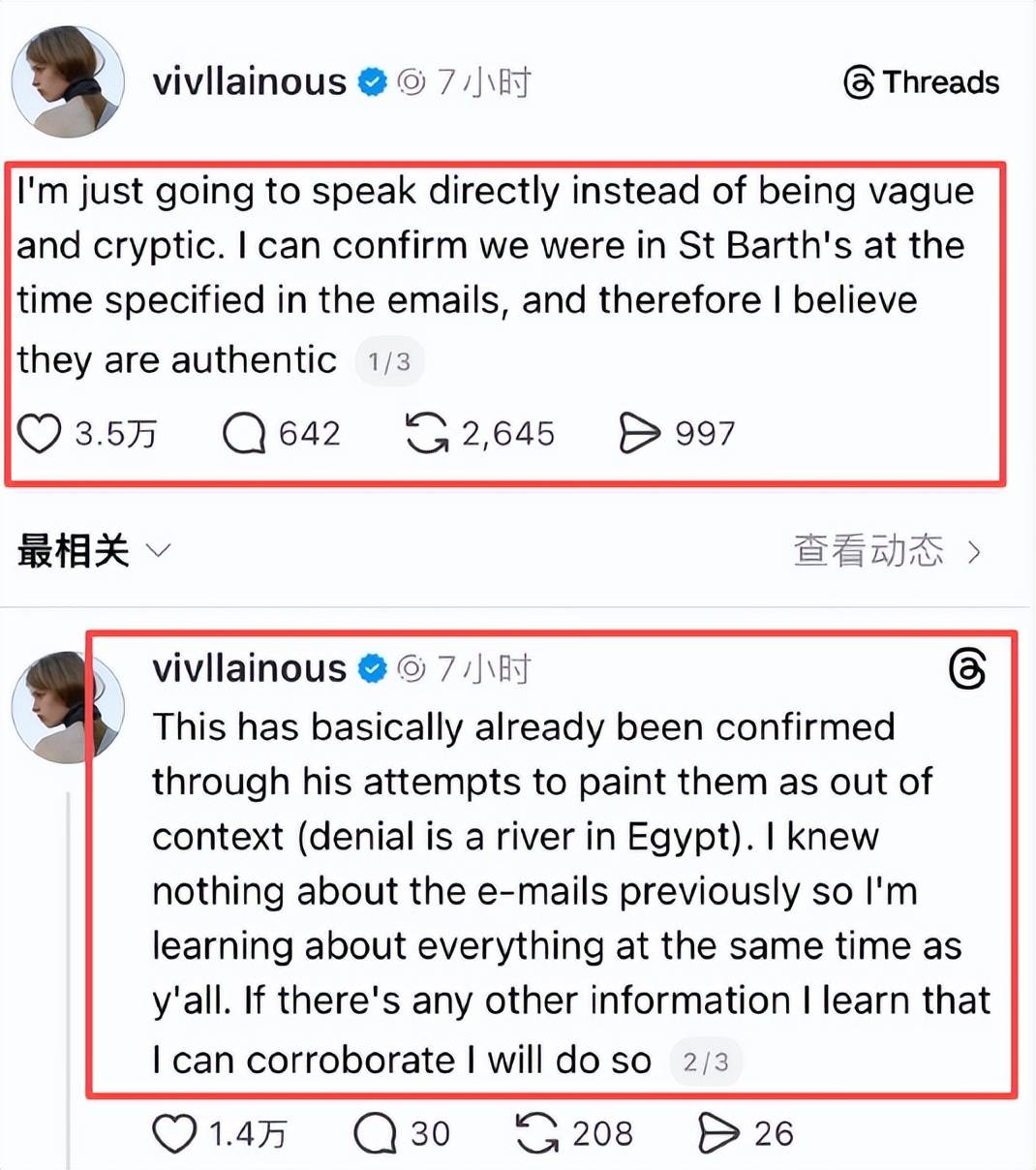 她在社交平台Threads发帖表示,“我可以确认,在邮件中提到的时间,我们(马斯克一家)确实身处萝莉岛,因此我相信那些邮件是真实的。”