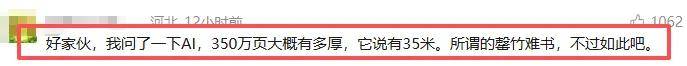 而这份长达350万页的文件,有网友问了AI,换成纸质,有35米高,可谓“罄竹难书”。