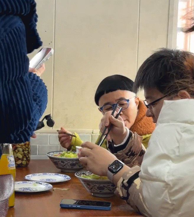 炸酱面上桌后,她边搅动碗里的面时,边和旁边的人说着话,这次两人是有说有笑的。