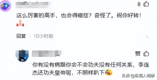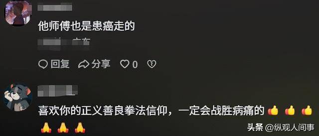 有网友直言:“不敢相信,小时候看他的《拳霸》觉得他是无敌的,怎么会患癌呢,瘦成这样看着太心疼了。”