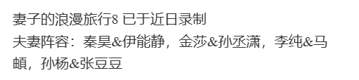 《妻旅8》开录!伊能静秦昊李纯马頔,孙杨逛超市金莎节目中备婚,期待这次的妻旅开播,感觉看点满满呀!