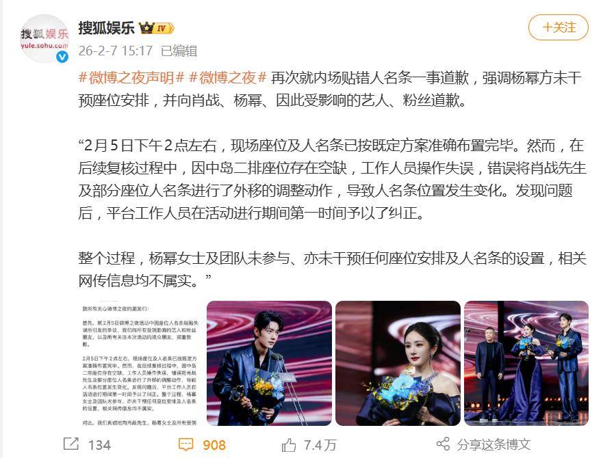 一场顶级娱乐盛典,最终的风头却被几张小小的座位人名条抢走。2月7日,微博之夜主办方再次发布长文声明,就2月5日活动当晚闹得沸沸扬扬的“座位风波”,向肖战、杨幂及所有受影响的艺人、粉丝郑重致歉。这波操作,堪称内娱公关的“危机复盘”现场教学。