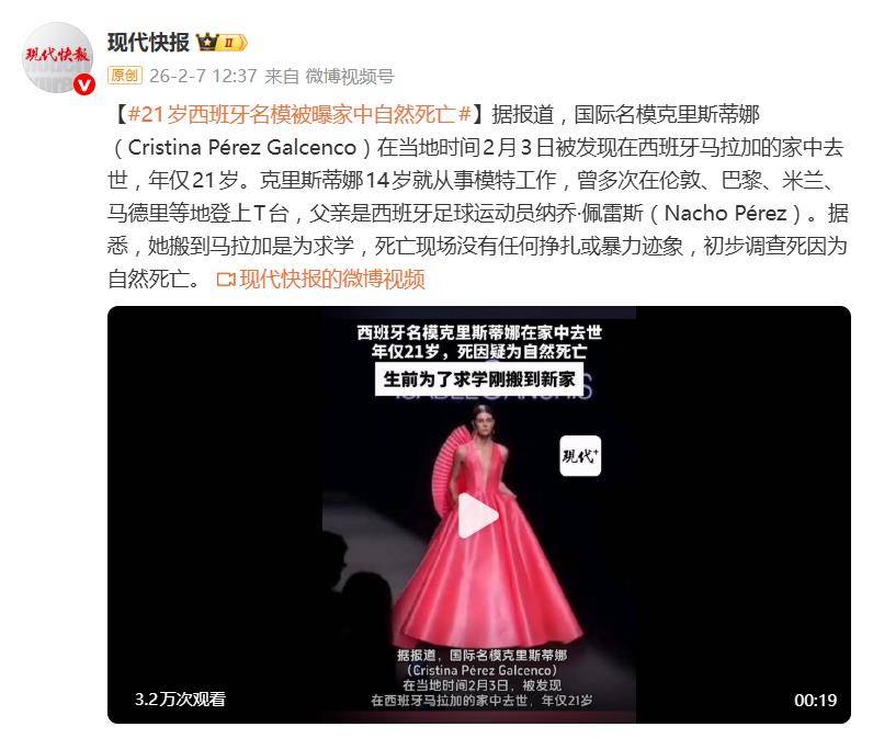 据2月7日报道,当地时间2月3日,一则噩耗从西班牙马拉加传来:国际名模克里斯蒂娜·佩雷斯·加尔琴科被发现在家中去世,年仅21岁。更令人错愕的是,现场没有任何挣扎或暴力迹象,警方初步调查给出的死因竟是“自然死亡”。一个正值青春、事业光鲜的年轻生命如此骤然消逝,瞬间在时尚圈和社交媒体上投下了一枚震撼弹。