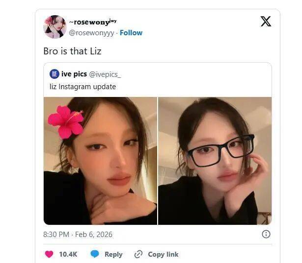 在这组新发布的自拍中,Liz尝试了两种趣味滤镜:一张头戴虚拟的花朵头饰,另一张则佩戴了眼镜造型的特效。风格偏向俏皮可爱。尽管有粉丝欣然接受并赞赏她展现出的不同面貌,但更多的声音却指向了过度修饰的问题——强烈的美颜效果使得她的面部轮廓异常平滑,几乎抹去了所有个人特征,达到了让许多路人网友感到陌生甚至“失真”的程度。