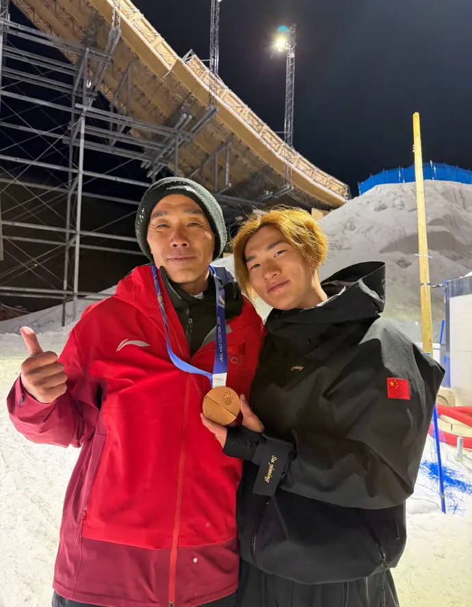 北京时间2月8日,在米兰-科尔蒂纳冬奥会单板滑雪男子大跳台决赛中,中国选手苏翊鸣获得铜牌,这是中国体育代表团在本届冬奥会获得的首枚奖牌。赛后,苏翊鸣更新社交平台,晒出与冬奥铜牌的自拍照和与教练佐藤康弘的合照。当天,是佐藤康弘的51岁生日,苏翊鸣给教练戴上冬奥铜牌庆生。