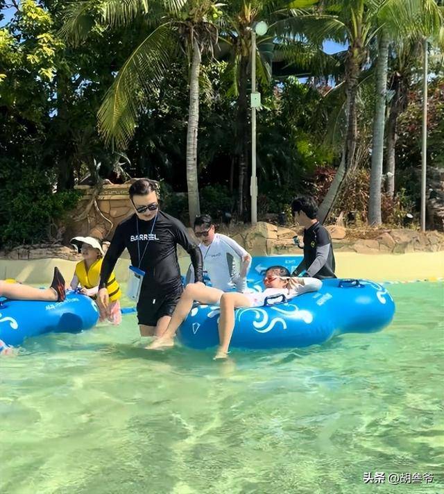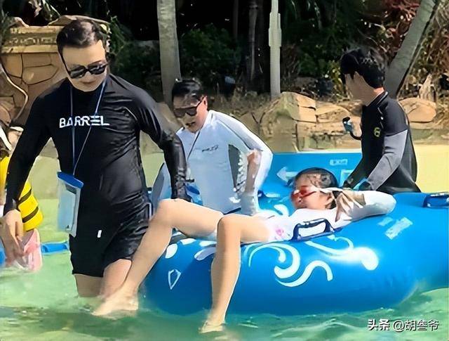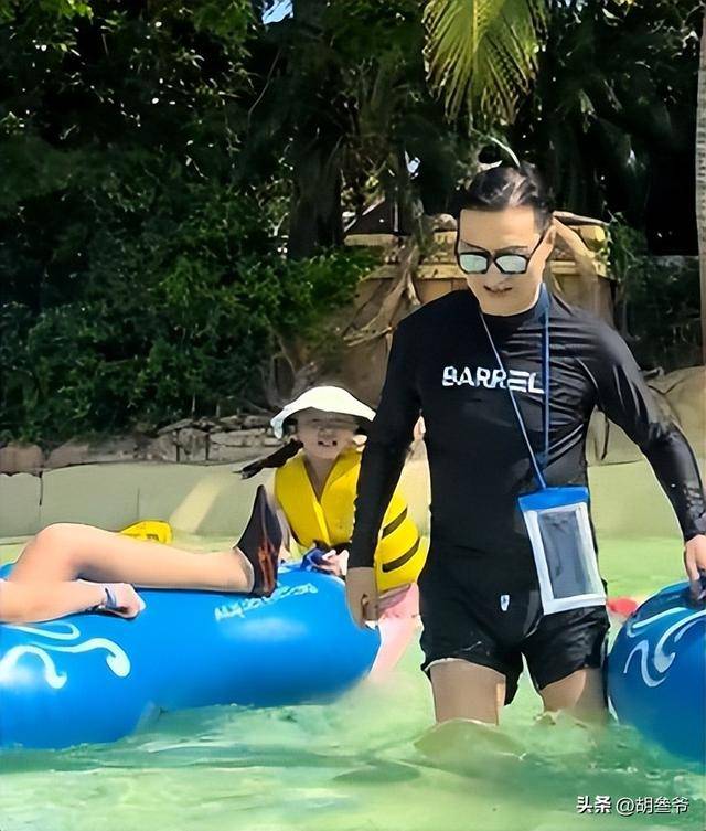 54 岁的汪峰就混在人群里,全程牵着 11 岁的醒醒,一门心思陪着女儿玩水。