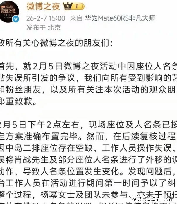 145万点赞的“要说法”微博发出后,仅仅62分钟,一份盖着红章的道歉声明就挂了出来。时间:2026年2月5日晚9点22分。但这场围绕杨幂、肖战和辛芷蕾的“微博之夜”座位风波,并没有因为官方的两次致歉而平息。