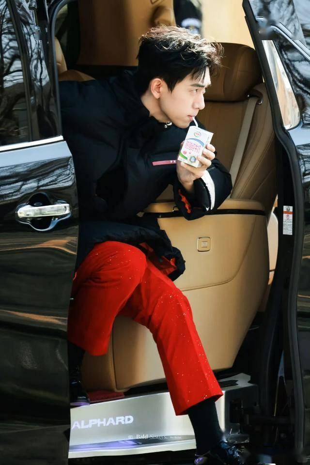 黑色宽松大棉袄裹着身形,搭配一条亮眼的红色裤子,配色简单却格外吸睛,没有精致的妆造,没有大牌的高定,就像冬日里出门逛街的普通男生,浑身透着松弛。