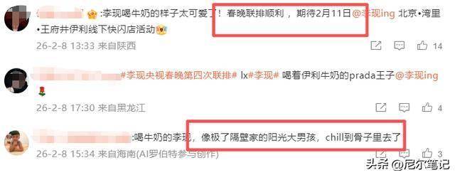 这次联排的路透曝光后,李现的状态和穿搭迅速引发网友热议,相关话题在微博、抖音等平台持续发酵,截至 2 月 8 日下午,# 李现喝牛奶萌翻全场# #丁禹兮喝咖啡李现喝牛奶# 等衍生话题也接连登上热搜。