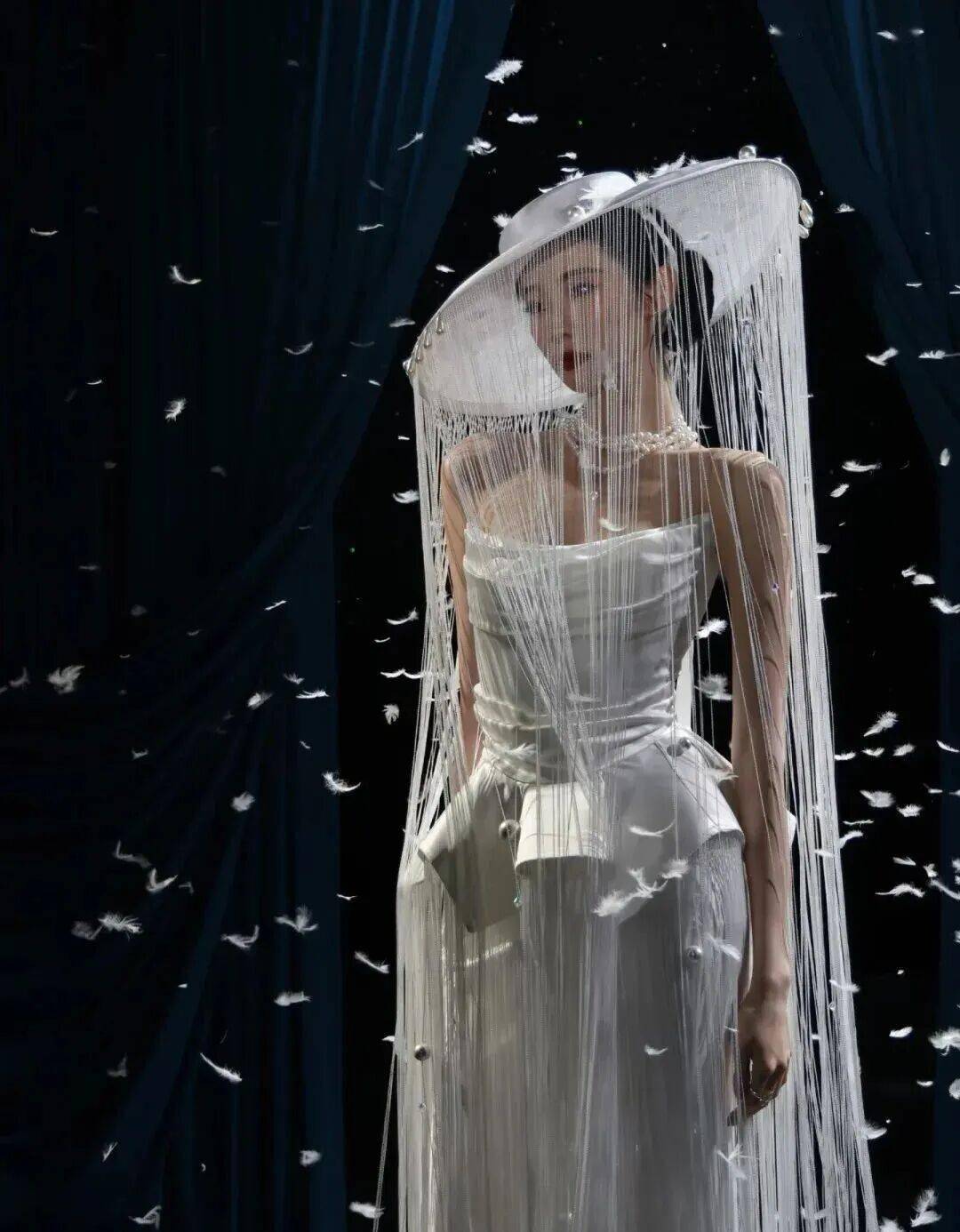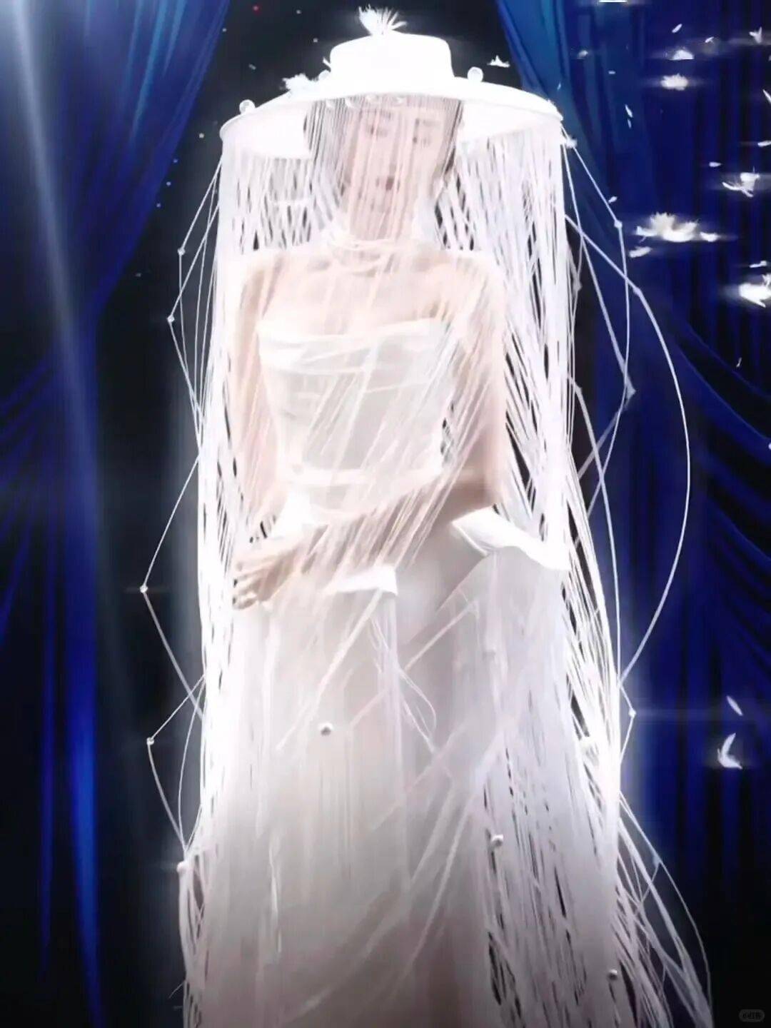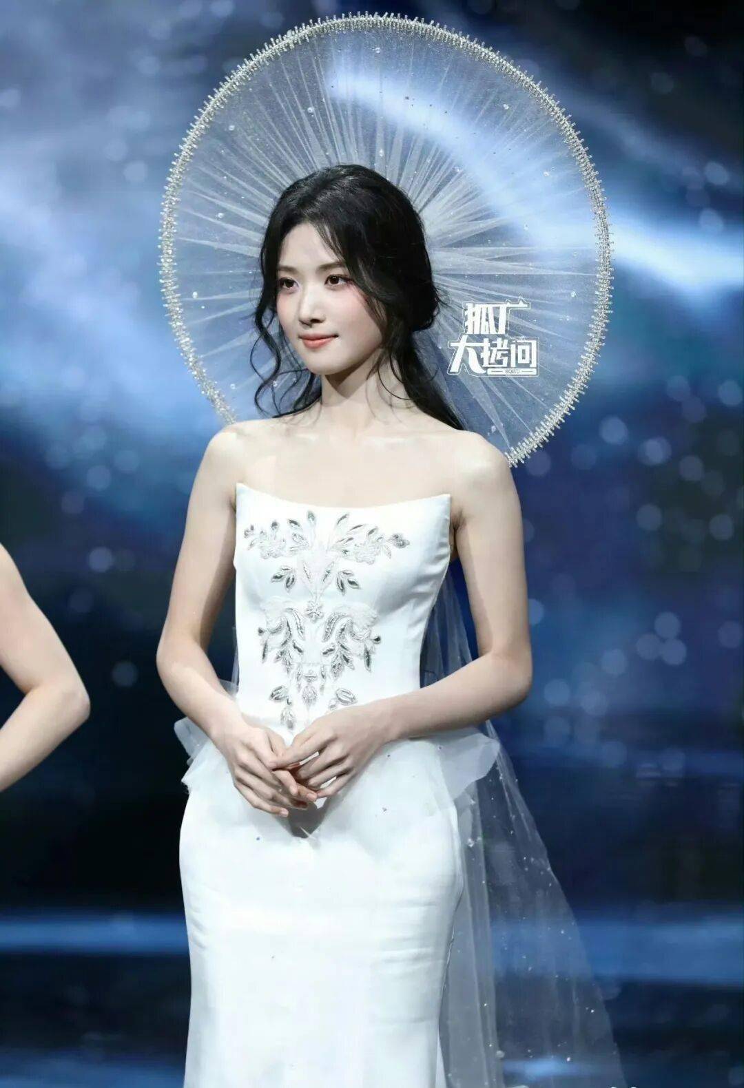 卢昱晓的月光女神造型,也有异曲同工之妙,利落的长裙搭配白色斗笠头纱,自带光环。