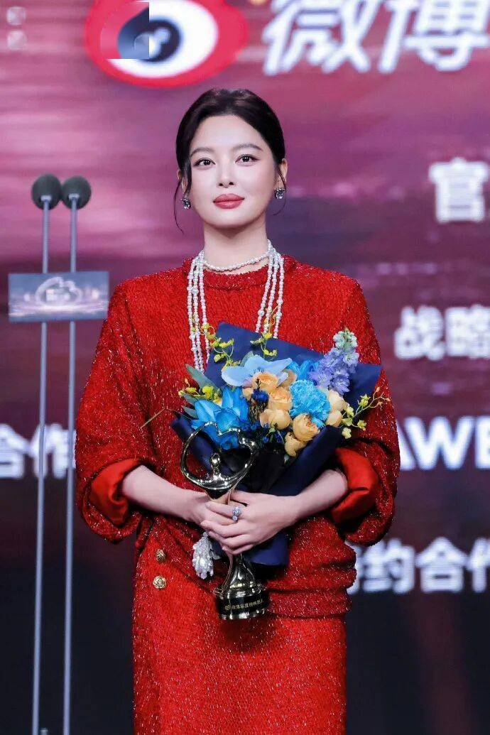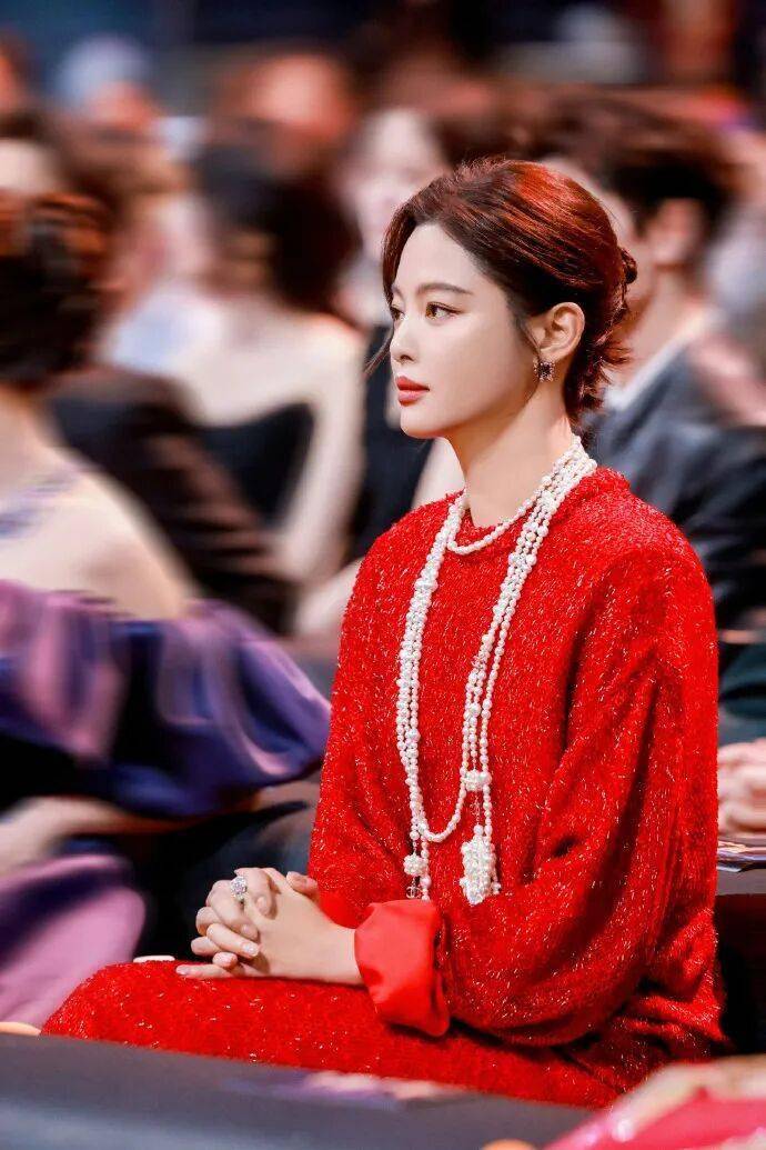 颁奖典礼一身香奈儿套装,红得浓郁又热烈,搭配珍珠长链优雅端庄,国际影后的范儿拿捏了。