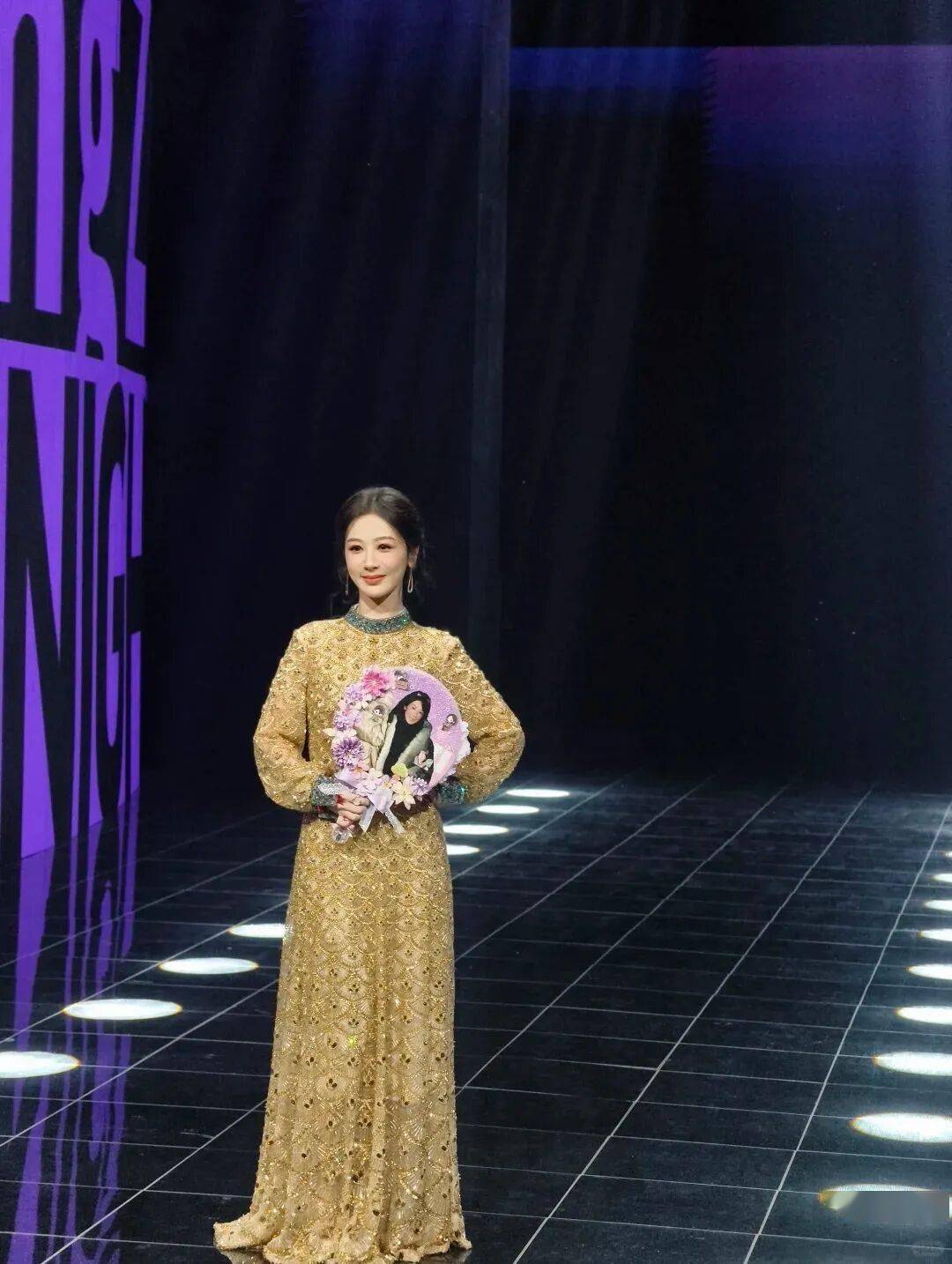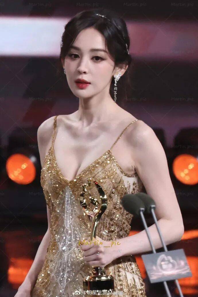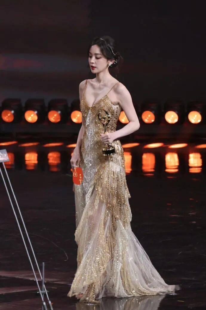 杨紫,金色Valentino长裙从脖子包到脚,看起来老气横秋。