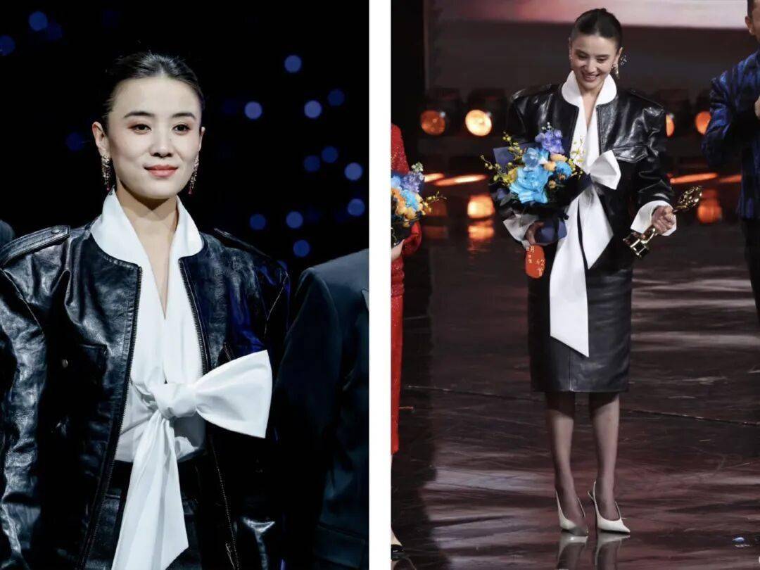 宋佳,经典的大背头造型,黑色廓形皮衣内搭白色蝴蝶结衬衫,高智飒酷这一块,永远是姐的统治区。