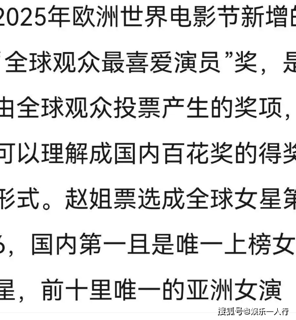 最近有个事儿特别有意思,微博之夜那边一群明星挤破头争热搜,赵丽颖呢?压根没去。好多人还在那说,哎哟,是不是过气了,资源不行了。结果你猜怎么着?人家扭头就拿了个牛哄哄的国际奖——欧洲世界电影节评的“全球观众最喜爱演员”,全世界女演员里排第六,中国就她一个上榜的。