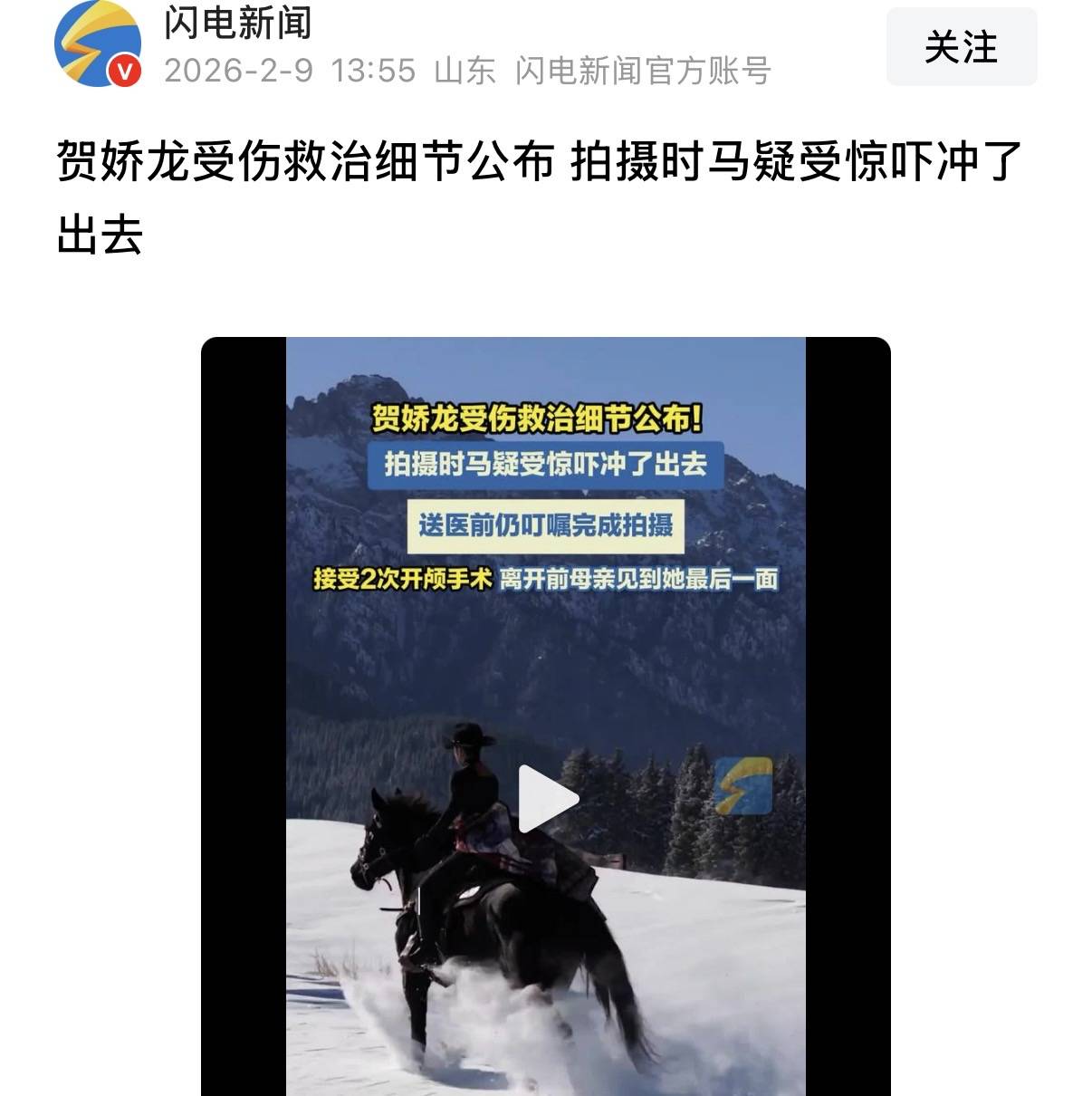 周围是一片收割后的玉米地,覆盖着一层白雪,还是雪地策马的画面。贺娇龙正在配合着摄影师拍摄近镜头的画面,这时候意外发生了。