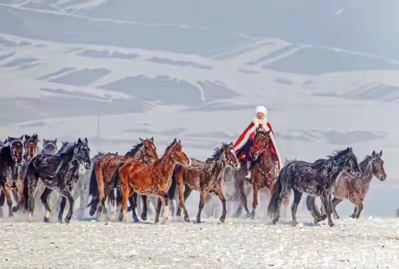 这次拍摄用的不是她自己的马,贺娇龙依旧选择了她钟爱的红色系装扮。深红色马甲搭配马面裙,在雪地里又飒又美。