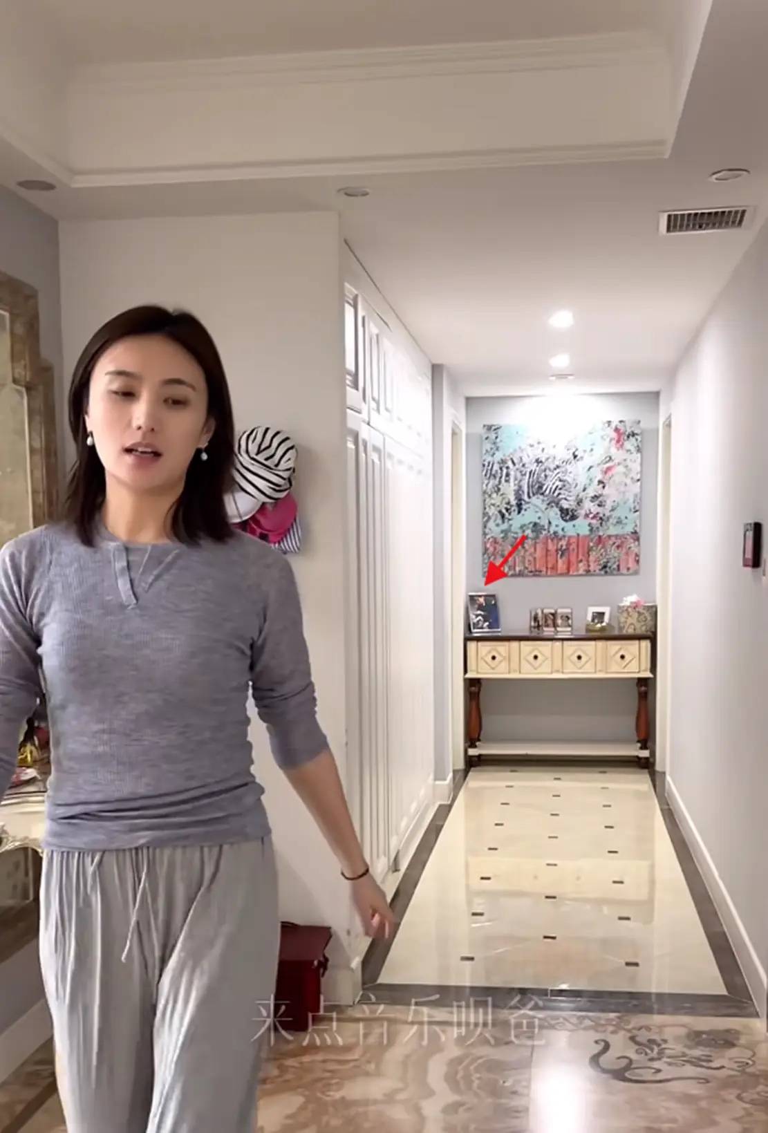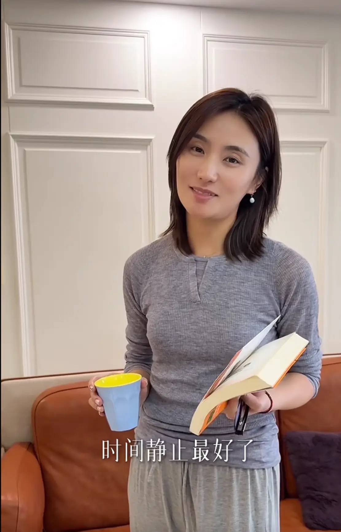 金喜在家中的打扮比较休闲舒适,一件修身的灰色针织衫、配了相对宽松的阔腿裤,她身材挺拔曼妙。