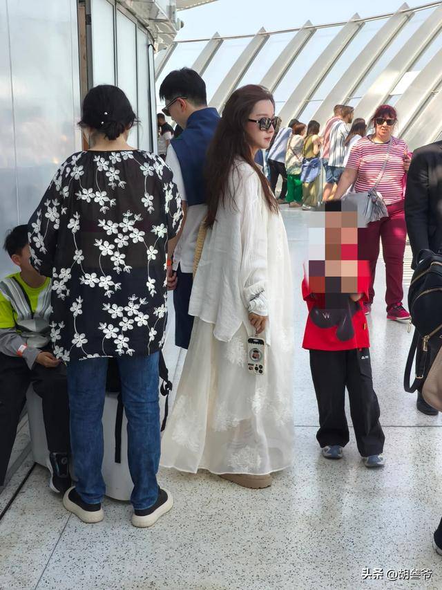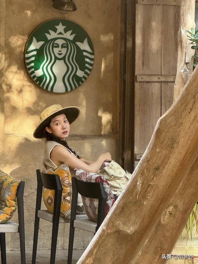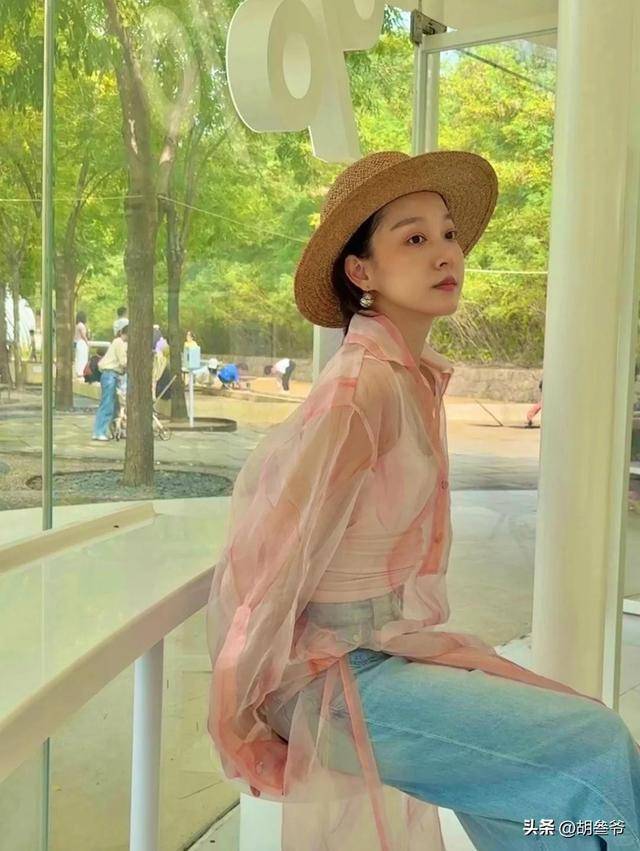 当时她穿的是米色马甲搭网纱长裙,还叠了条长裤,头戴编织草帽,身形苗条得很,完全看不出是两个孩子的妈妈。