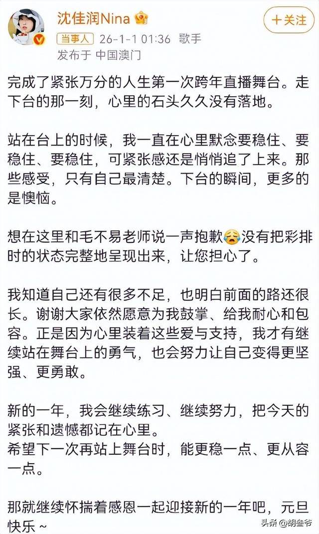 表演结束后,沈佳润在凌晨发了文,坦言是紧张导致没呈现彩排状态,还专门向毛不易道歉,说 “让您担心了”,承诺会铭记遗憾,加强练习。