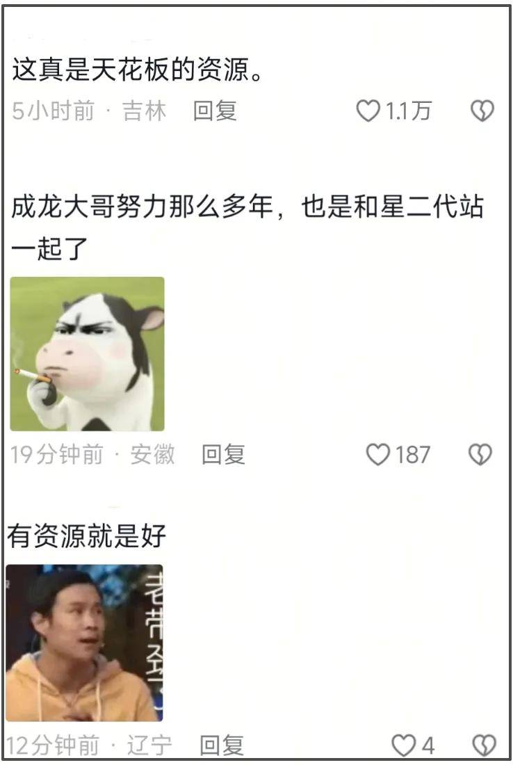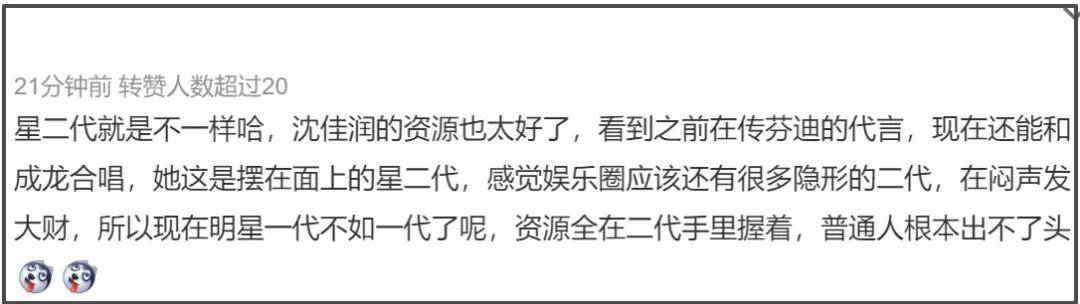 德不配位,却依旧受到力捧的结果就是路人缘崩塌,全网口碑翻车。沈佳润在某短视频平台发布了和成龙合作的推广曲片段,该视频评论区前排沦陷。大家一边感叹着沈佳润这“天花板的资源”,一边阴阳怪气地留言“成龙大哥努力那么多年,也是和星二代站一起了”。