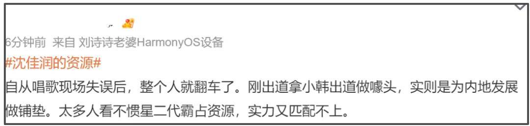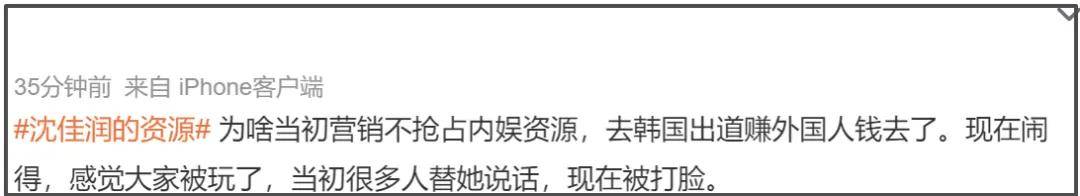 随后,“沈佳润的资源”这一话题登上了热搜榜单。一方面,大家觉得沈佳润作为星二代霸占许多好资源,实力却匹配不上,让人看不惯;另一方面,大家认为当初沈佳润在韩国出道,释放出不抢占内娱资源,去赚外国人钱的信号,现在却频繁在内娱活动,大家觉得被欺骗了,让她去韩国搅合,放过内娱。