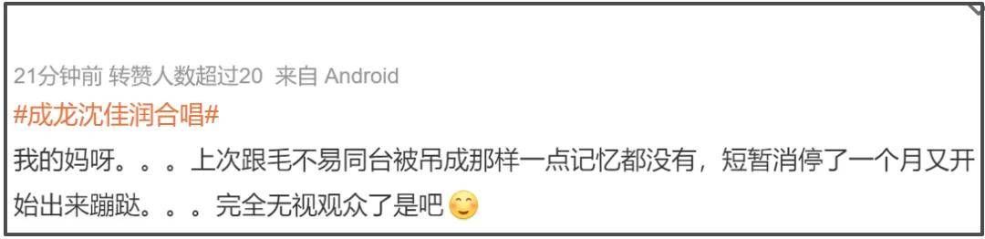 意料之外,情理之中地,沈佳润这一次口碑大翻车。在“成龙沈佳润合唱”的话题广场中,大批网友吐槽沈佳润是资源咖、关系户。有人提起沈佳润之前在跨年晚会上和毛不易合唱《不染》跑调、实力被吊打,指责她短暂消停一个月之后又开始出来蹦跶。