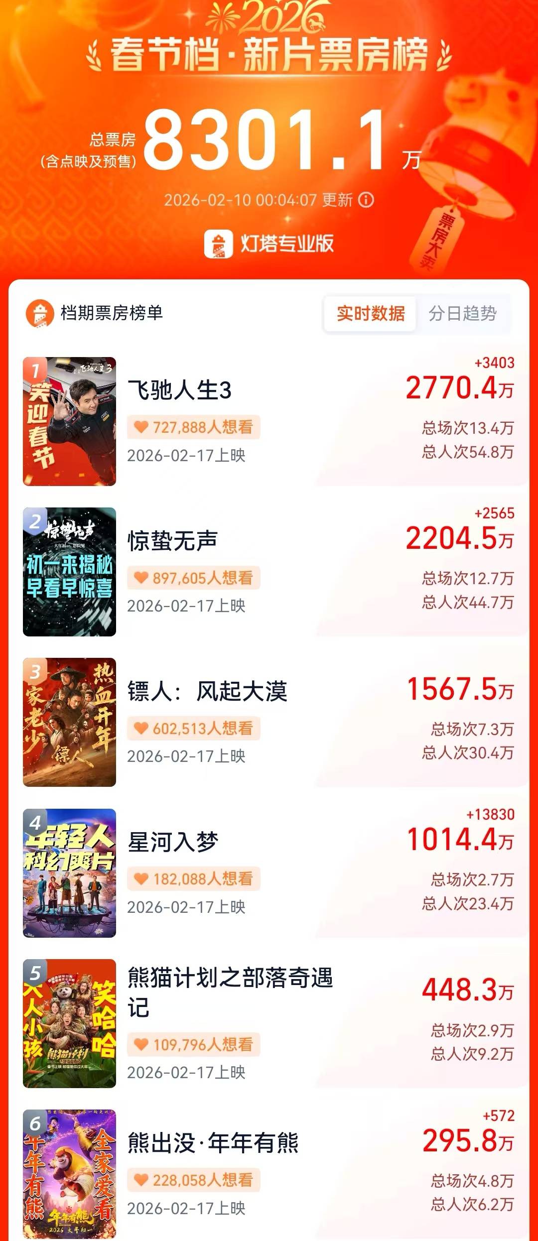 2月10日,六部春节档影片开启预售,根据灯塔专业版数据,截止24:00开预售首日预售总票房约8300万元,表现领先2023年和2024预售开启首日,不如去年同期。韩寒的喜剧续作《飞驰人生3》