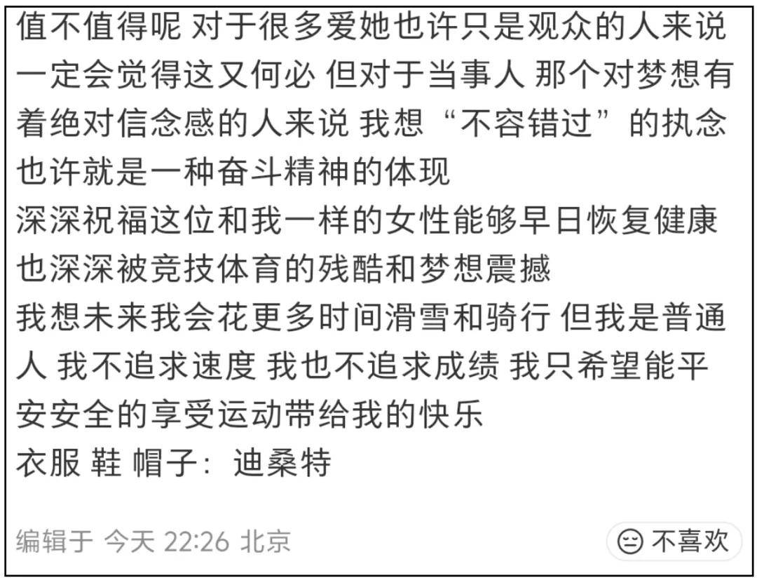 如果说配文提及品牌,是为了感谢品牌邀请,那配图风格总是杨天真自己选择的吧——41岁女运动员赛场出事,你搁这摆着姿势展示曼妙身材,何意味啊?