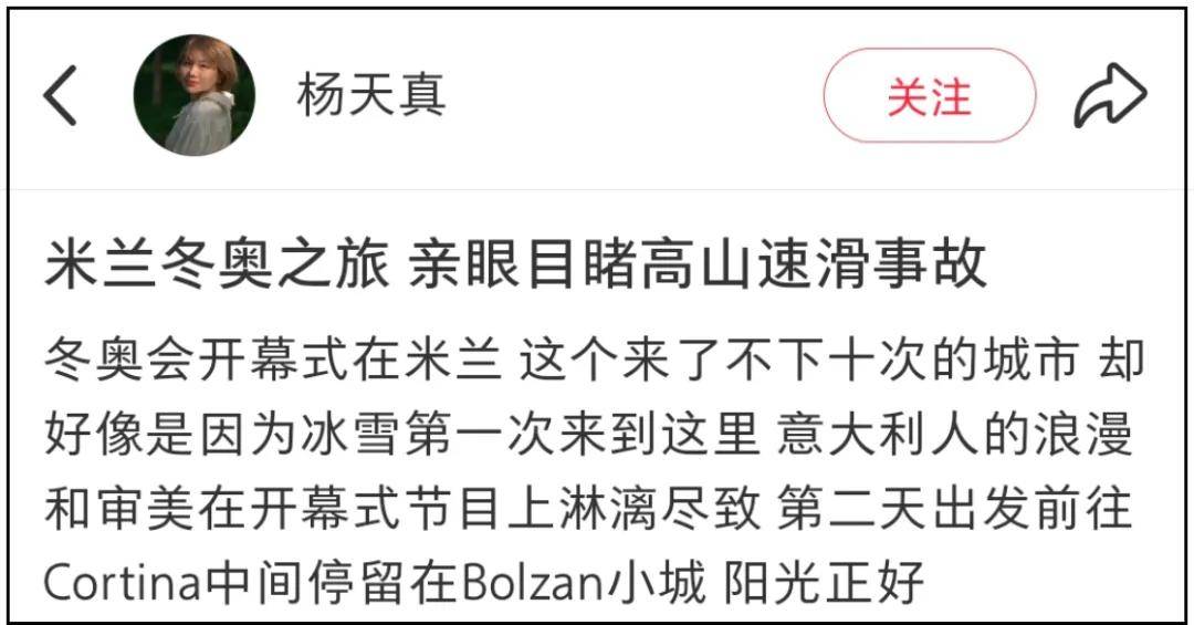 只见杨天真社媒动态标题直接就写着“米兰冬奥之旅,亲眼目睹高山速滑事故”,还配了一大段长文和多张live图。