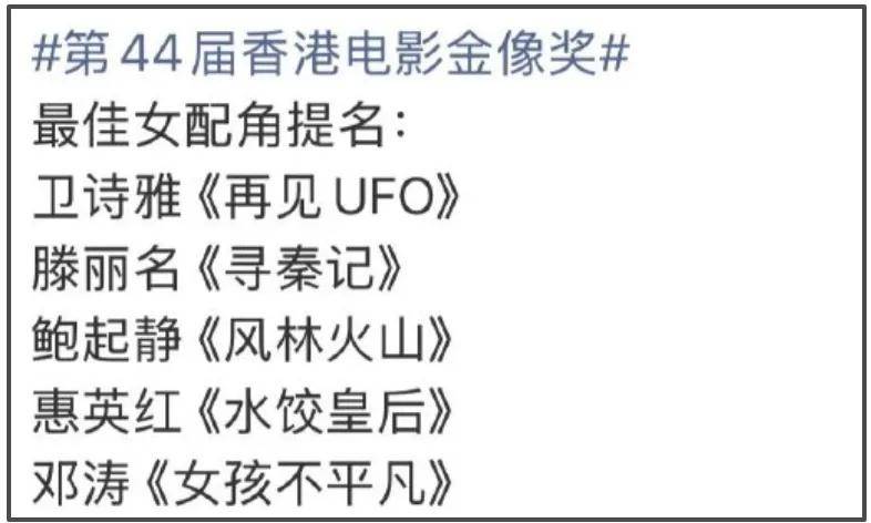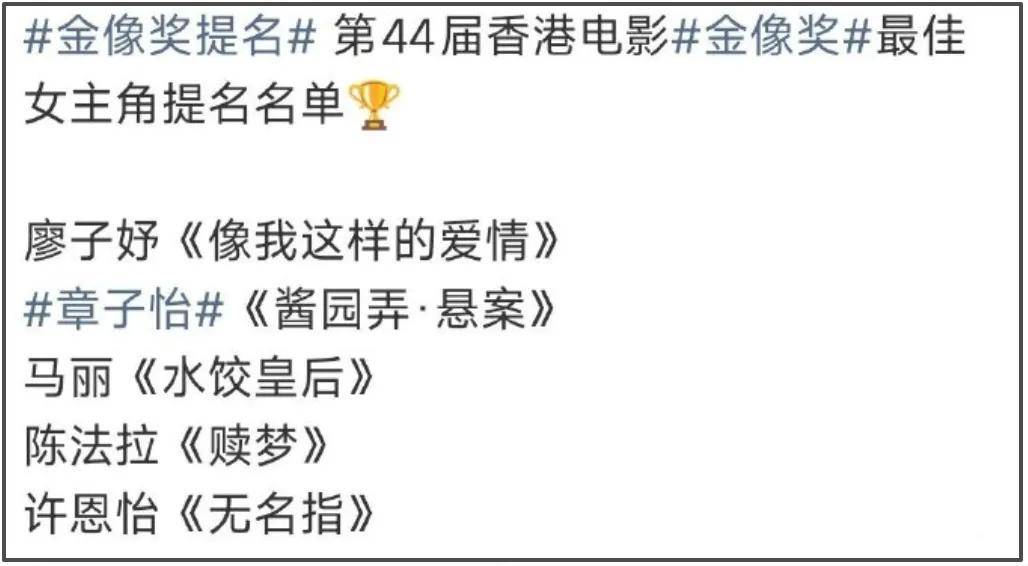 万众期待之下,第44届香港电影金像奖提名名单终于公布。惊喜的是,章子怡和马丽提名最佳女主角;遗憾的是,杨幂和赵丽颖两位85花都没能提名最佳女配角。只是,杨幂虽然没能入围,但收获的热度和讨论度却居高不下,还因为提前开香槟而备受争议。