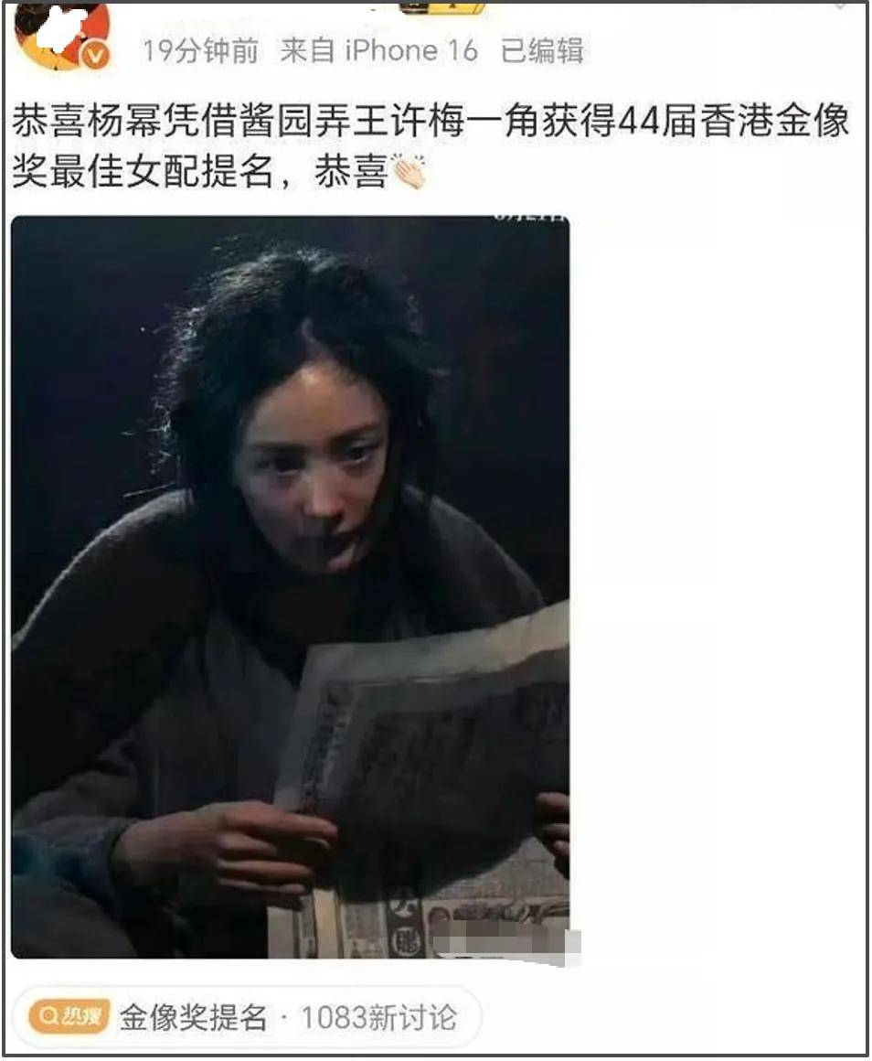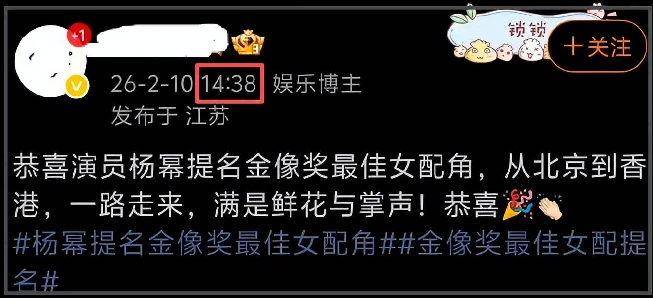 据悉,金像奖提名名单公布时间为14:30。可是,在最佳女配角提名名单尚未揭晓的时候,已经有不止一位博主发文庆祝杨幂提名金像奖最佳女配角。某博主还自制了提名海报,一看就是有所准备。虽然提名名单没出来,但是庆祝杨幂提名的话题和海报早已准备就绪。