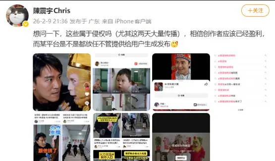 2月10日,周星驰经纪人陈震宇公开发声,质疑某平台用户使用AI技术生成、传播周星驰影像并以此牟利,已经涉嫌侵权,同时指出平台存在明显监管漏洞。此事迅速引发全网热议,大家纷纷关