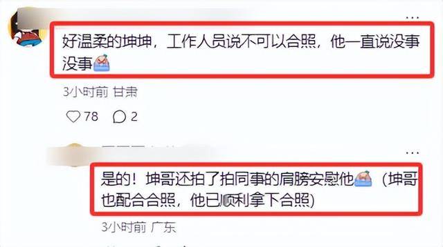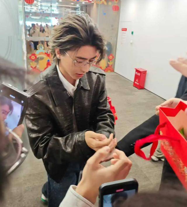 有个刚入职的实习生想合影,被工作人员拦了下,蔡徐坤刚好听见,回头摆手说“没事没事,没关系”,还主动凑过去一点,让实习生能把两人都框进镜头。