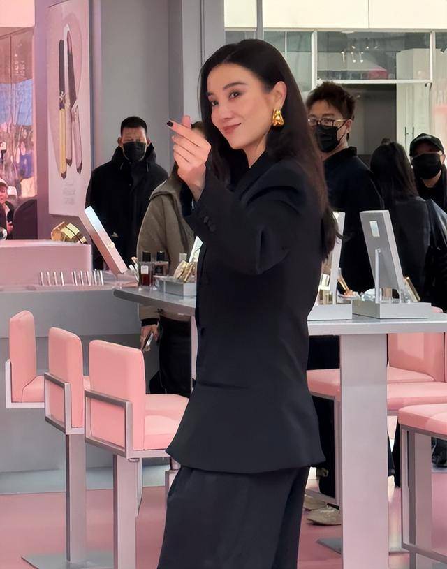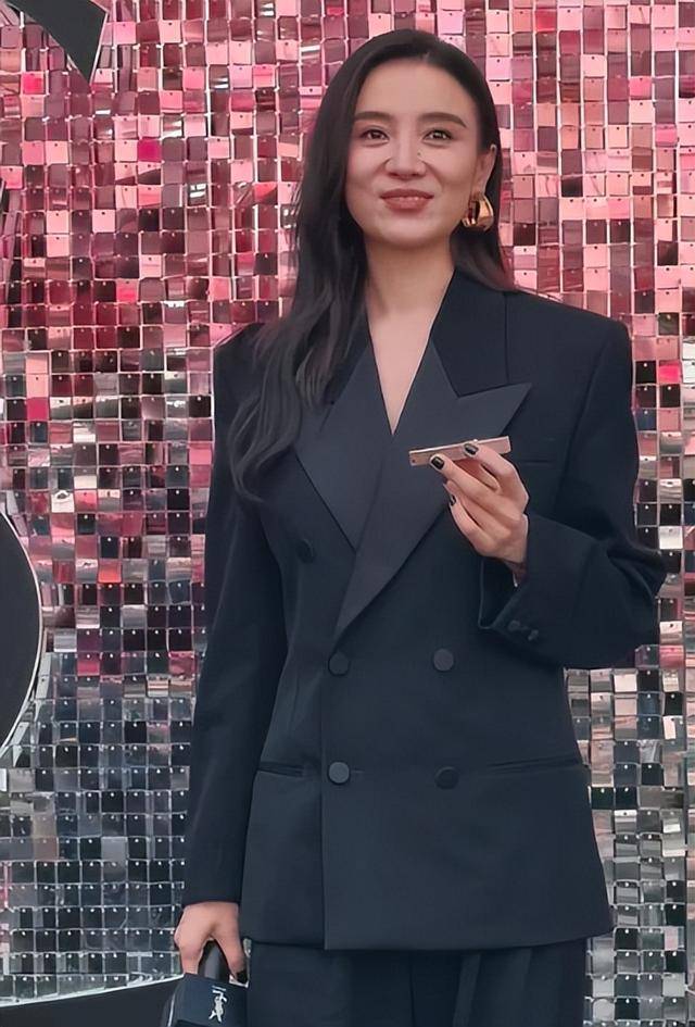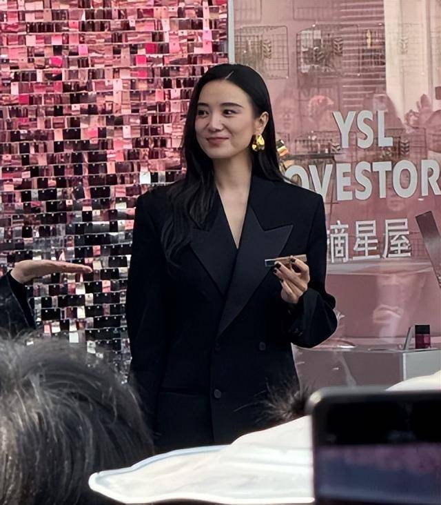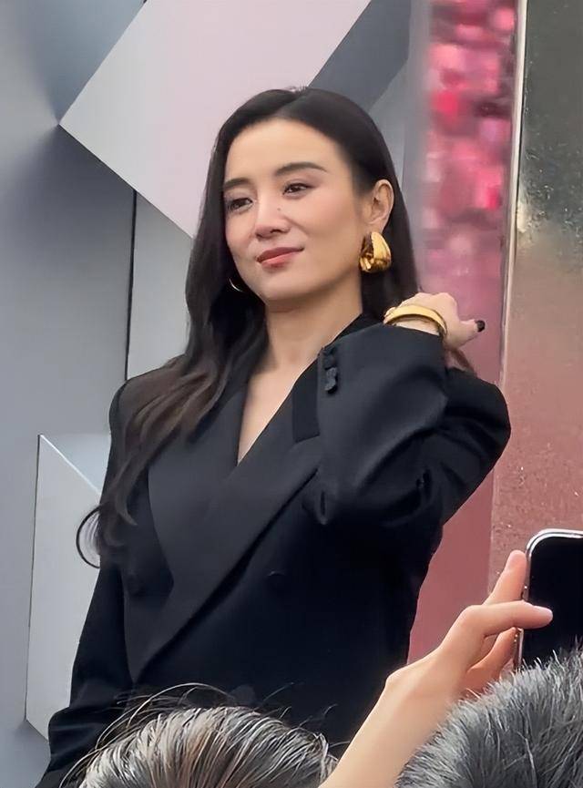 耳朵上戴的大金色耳环很吸睛,是圆形坠子款,不是夸张的大logo,灯光下亮却不晃眼,和黑色西装形成反差,衬得皮肤更白。