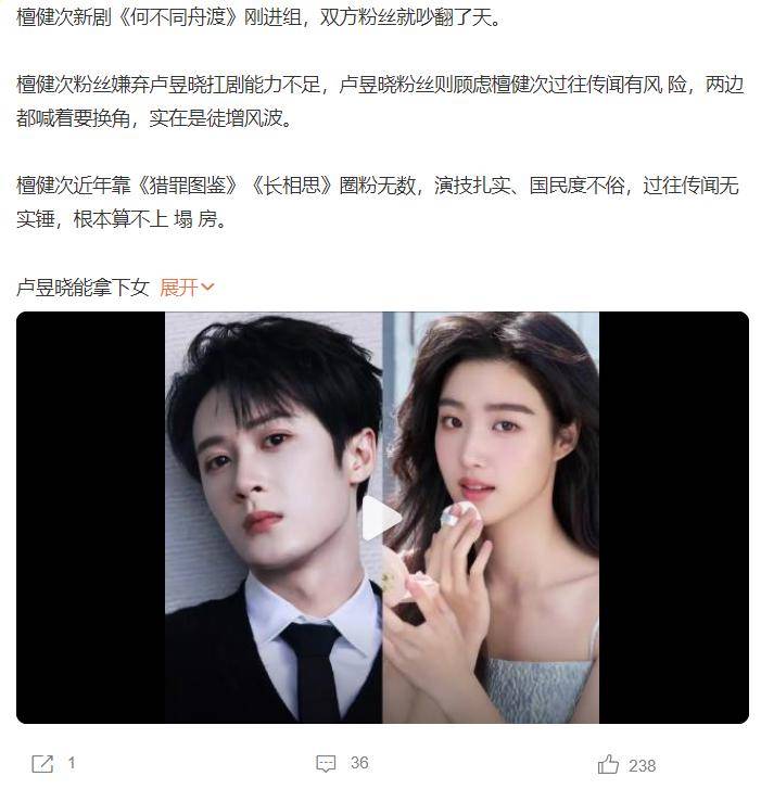 《何不同舟渡》没官宣前,檀健次的粉丝和卢昱晓的粉丝就已经吵起来了,檀健次的粉丝嫌弃卢昱晓没有扛剧能力,而卢昱晓的粉丝认为檀健次有绯闻风险,所以双方都喊着要换角。