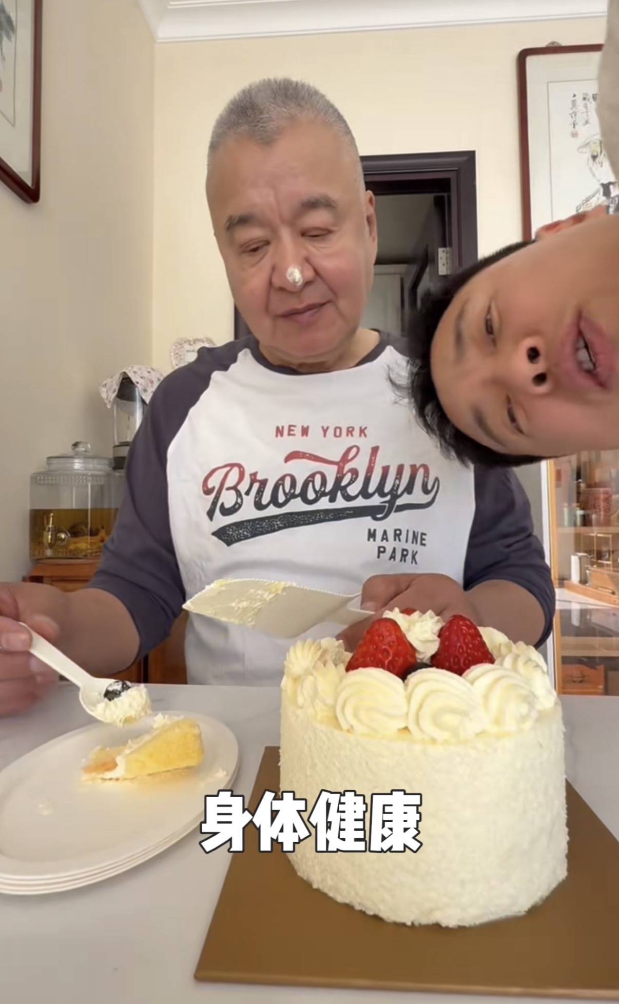 高云翔不仅给父亲准备了长寿面,还买了一个小小的生日蛋糕,把奶油抹在父亲鼻子上。虽然只有父子两个人,但是氛围很欢乐。